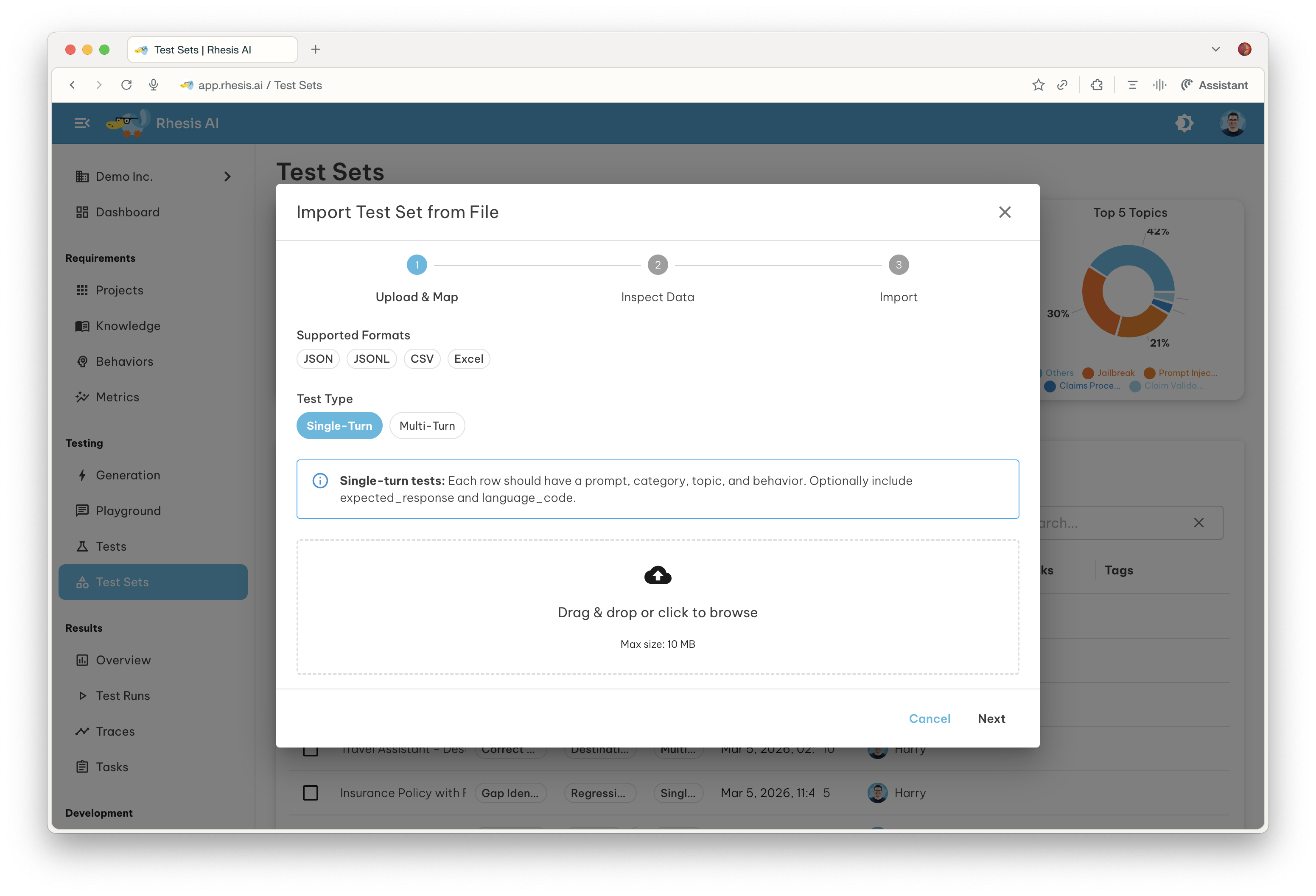 Select the correct Test Type before uploading your file. The available mapping fields and validation rules differ between Single-Turn and Multi-Turn, and the type cannot be changed after the file has been analysed.